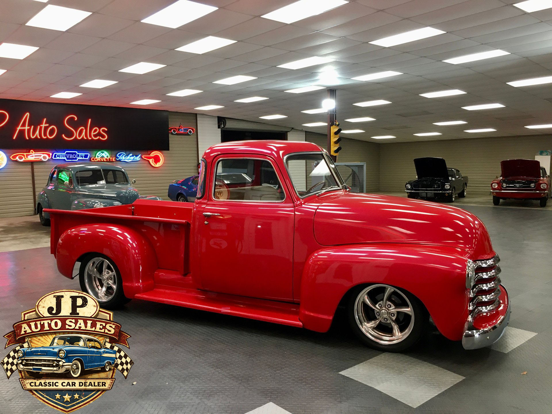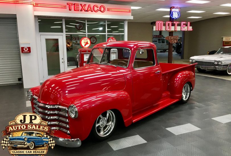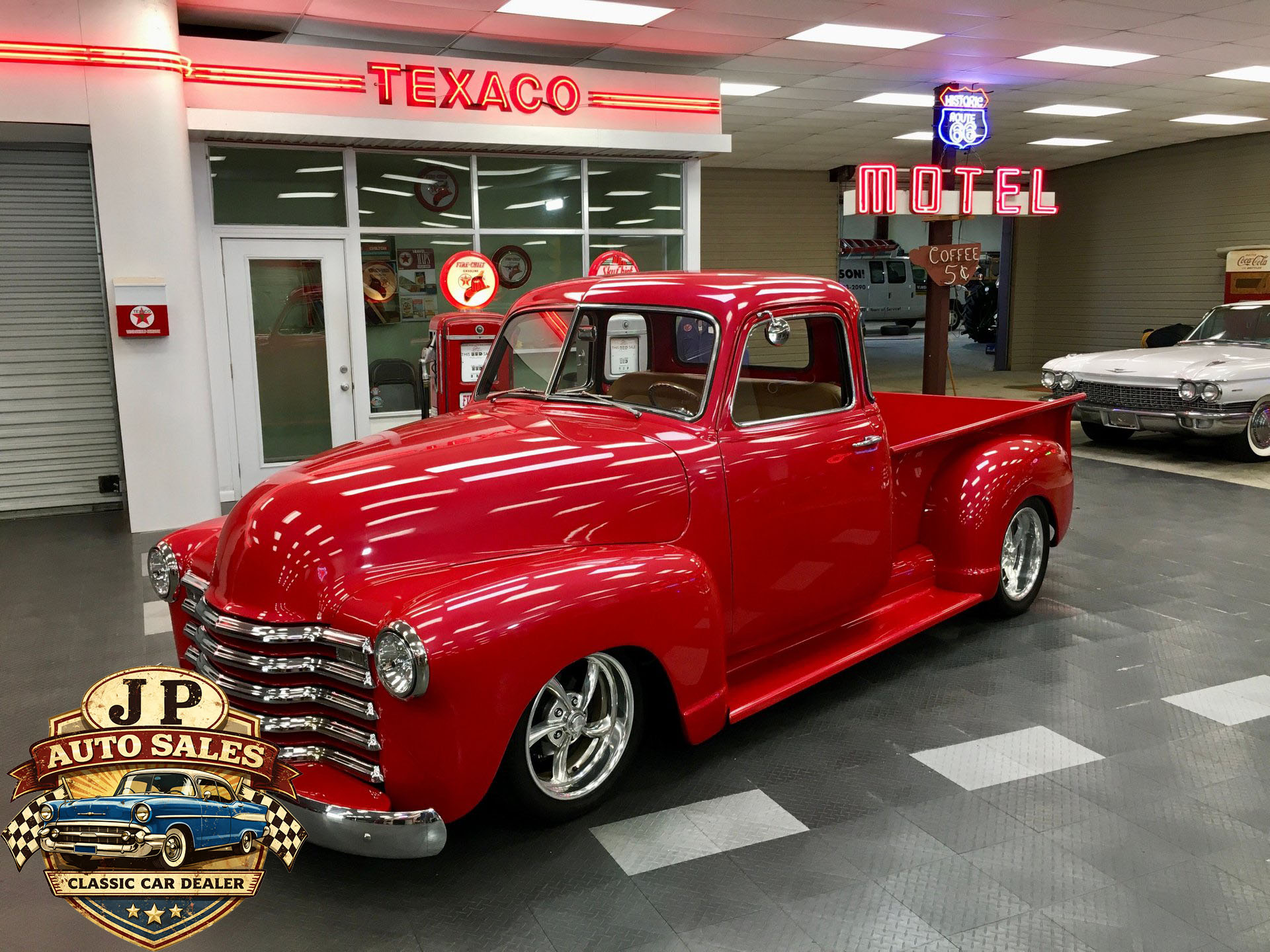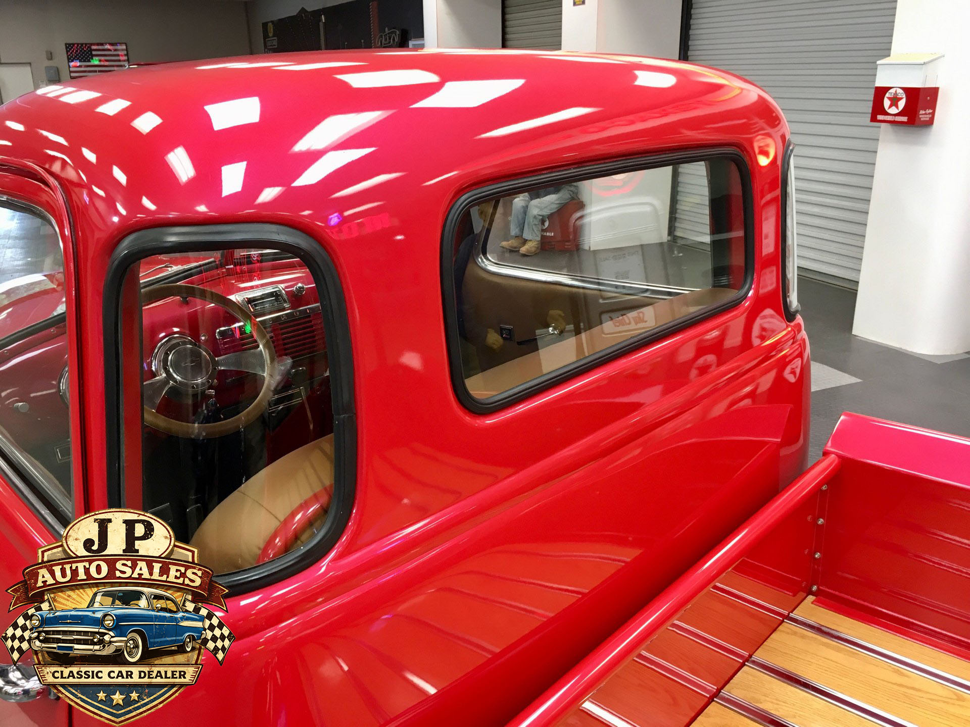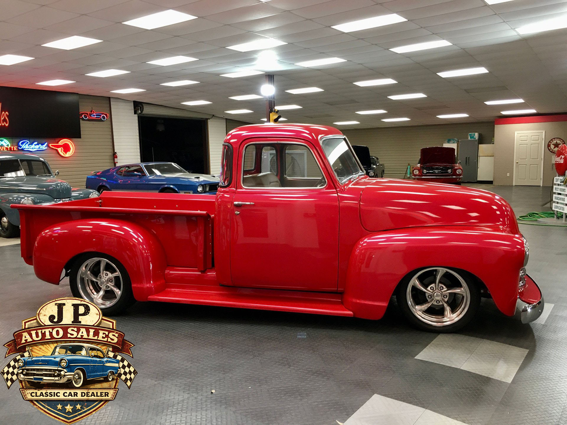 1949 Chevrolet 3100 Restomod Pick Up – Frame-off built on a solid 5-window truck. Powered by a GM ZZ4 350 V8 with aluminum heads, Edelbrock carb, and headers, paired with a 700R4 automatic. Features include Heidt's IFS front suspension, power rack and pinion steering, power disc brakes, and a Currie 9" rear axle. The body is arrow straight with new chrome, stainless, glass, and weather stripping. Inside, enjoy custom tan leather seats, Classic Instruments gauges, Vintage Air, power windows, and an AM/FM/AUX stereo. Finished in show-quality Red Pearl paint with a new oak bed. Ready to show and go!