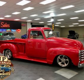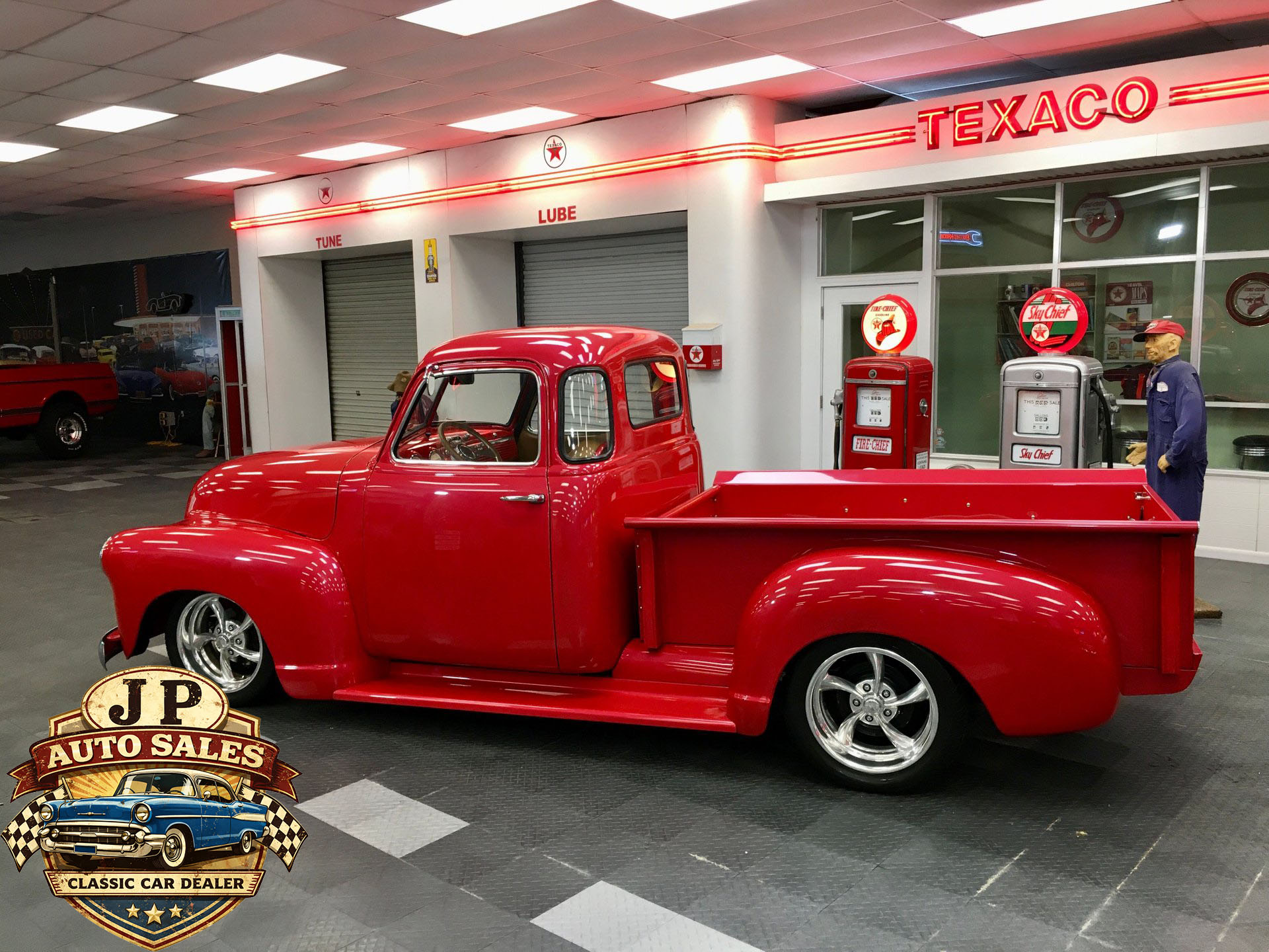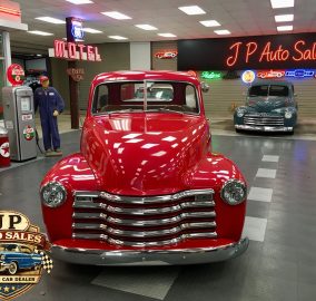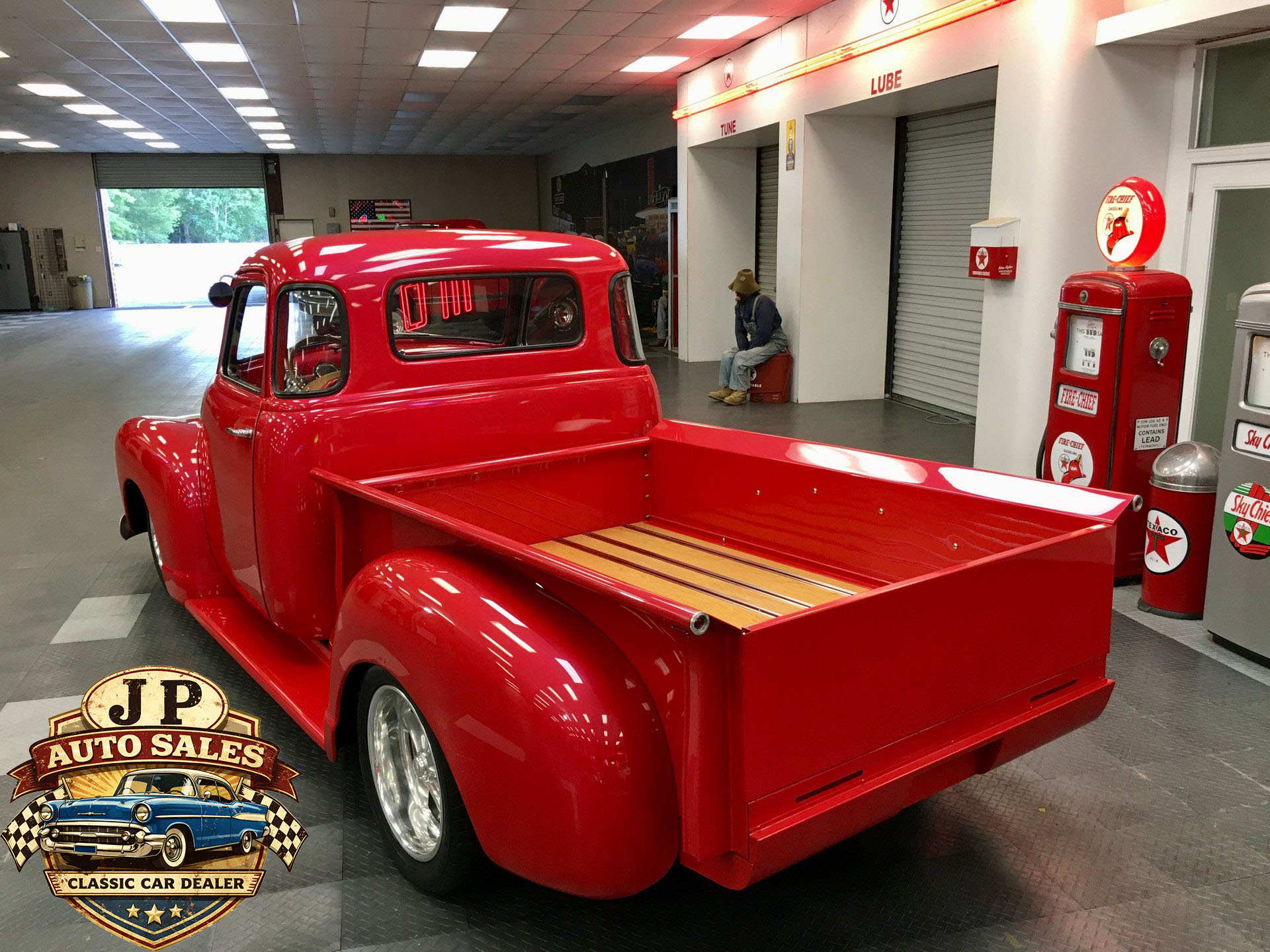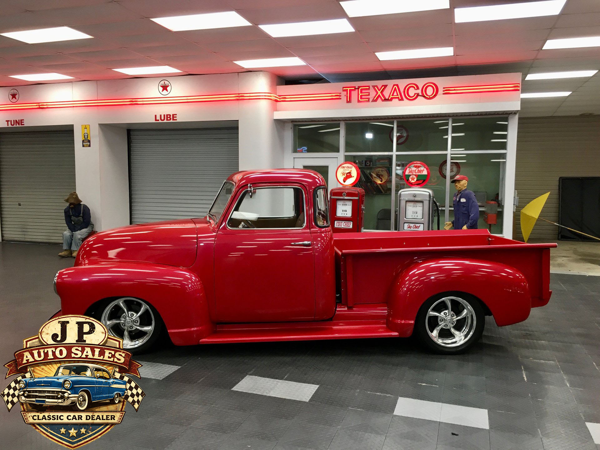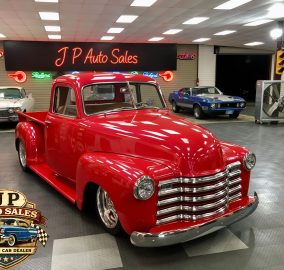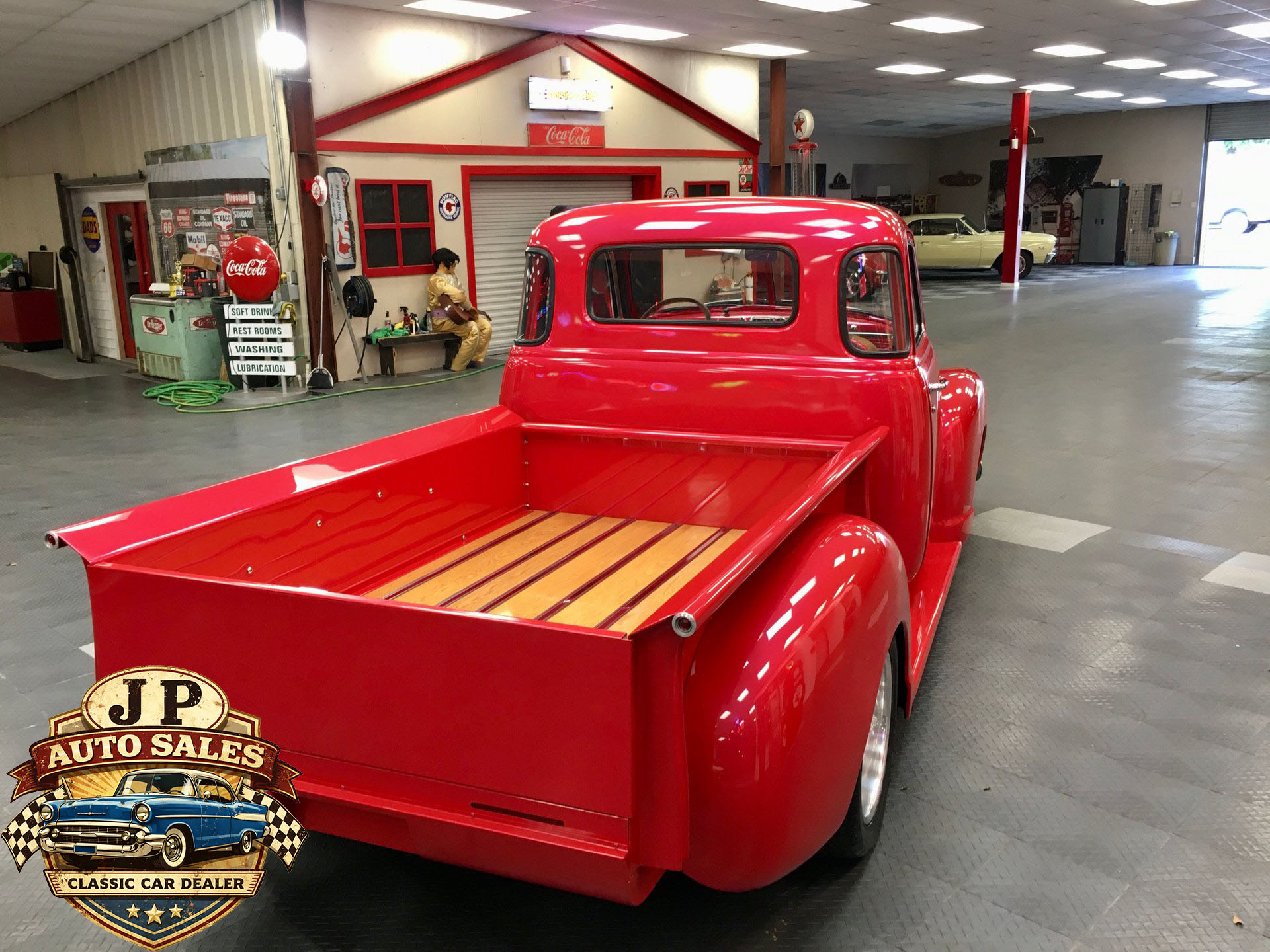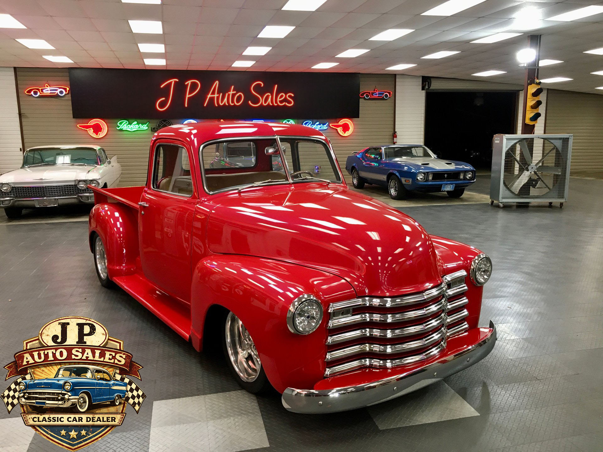1949 Chevrolet 3100 Restomod Pick Up – Frame-off built on a solid 5-window truck. Powered by a GM ZZ4 350 V8 with aluminum heads, Edelbrock carb, and headers, paired with a 700R4 automatic. Features include Heidt's IFS front suspension, power rack and pinion steering, power disc brakes, and a Currie 9" rear axle. The body is arrow straight with new chrome, stainless, glass, and weather stripping. Inside, enjoy custom tan leather seats, Classic Instruments gauges, Vintage Air, power windows, and an AM/FM/AUX stereo. Finished in show-quality Red Pearl paint with a new oak bed. Ready to show and go!