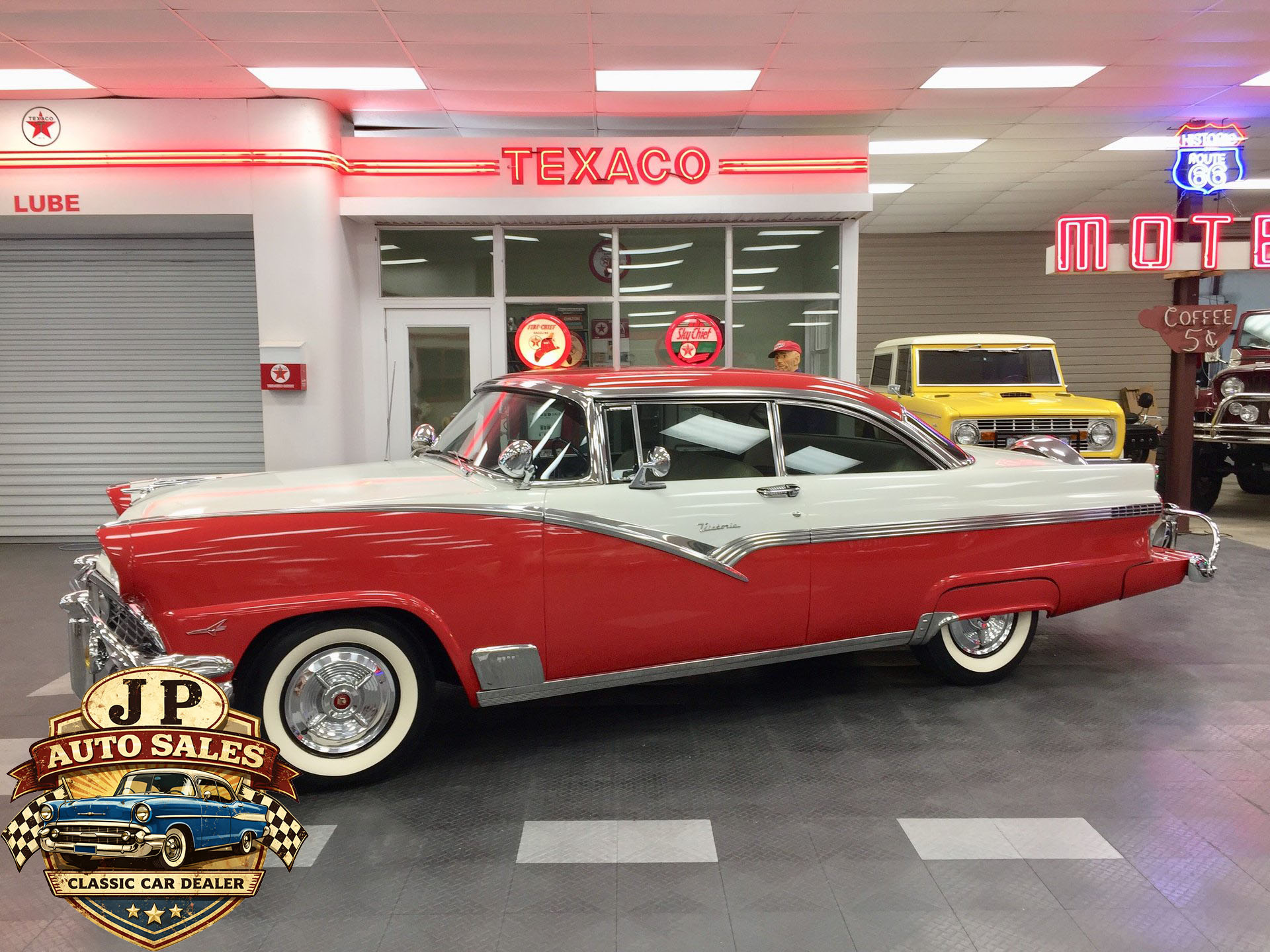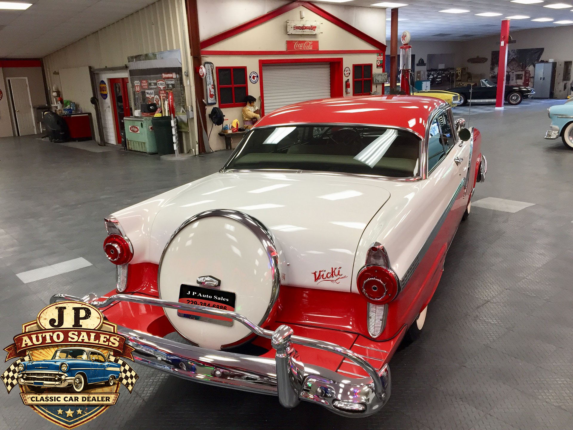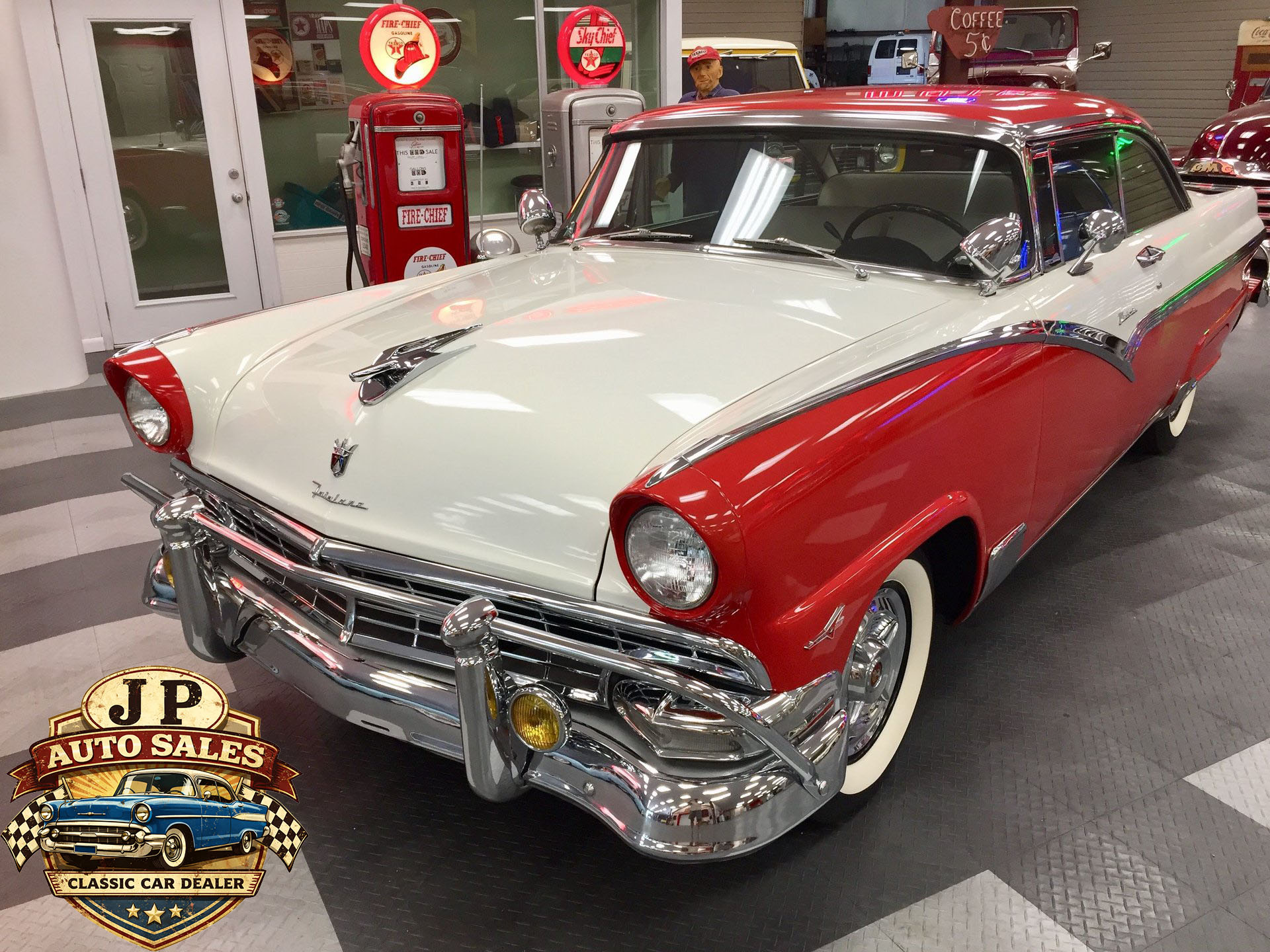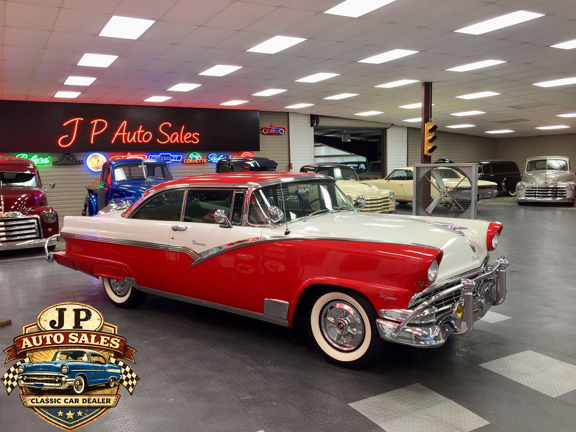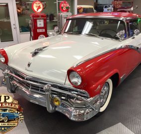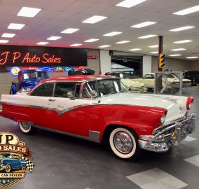 1956 Ford Fairlane Victoria 2 Door Hardtop – Powered by a 292 V8 with a 4-barrel carb, paired with an automatic transmission. Features include a classic red and white exterior, black and white interior, air conditioning, power steering, AM/FM/AUX radio, and tinted windows. Equipped with electric wipers, dual master cylinder, Petronix electronic ignition, fog lights, and a Continental kit. Additional touches include fender skirts, wide white radial tires, and front/rear cattle bars for a standout look.