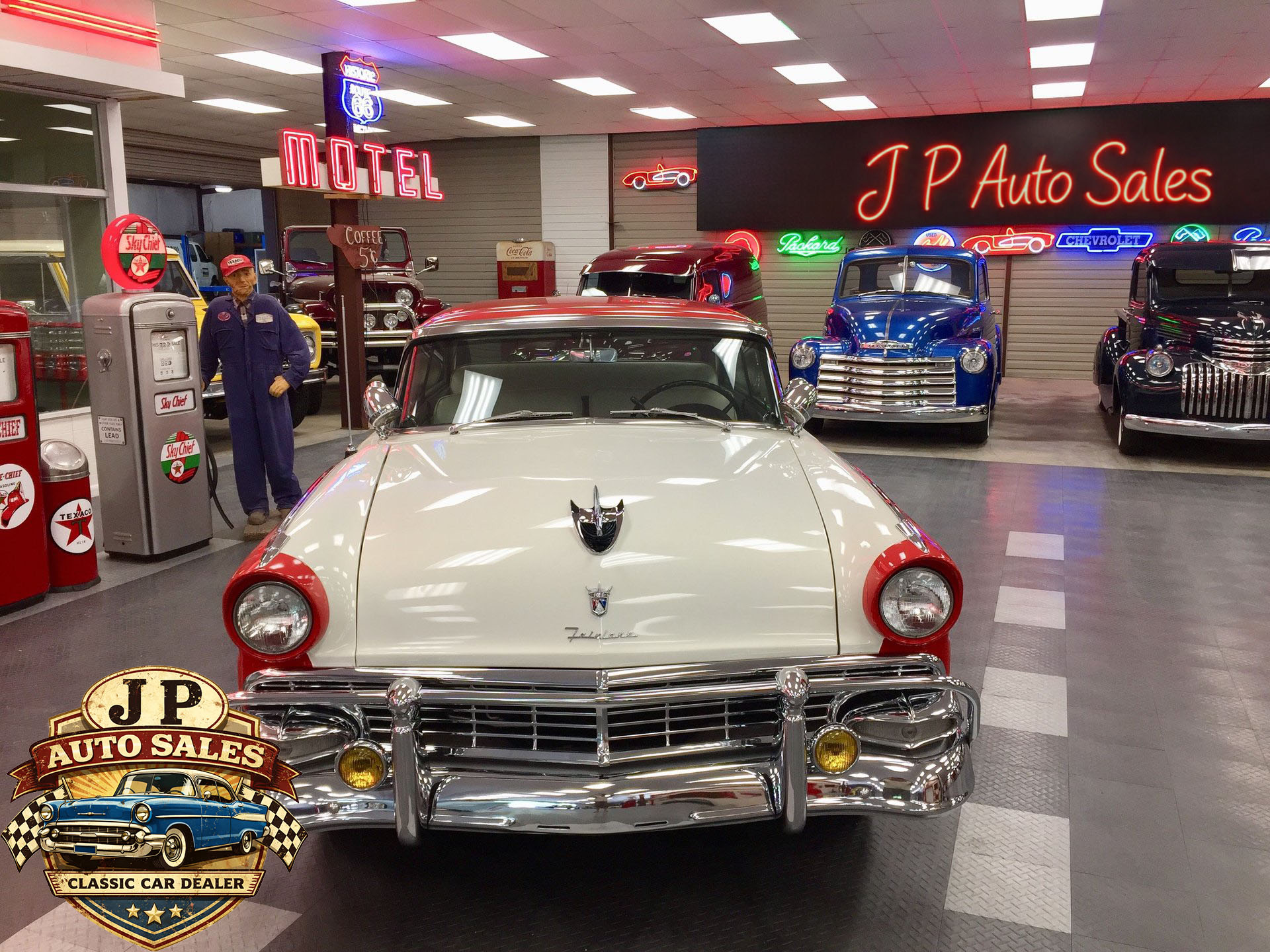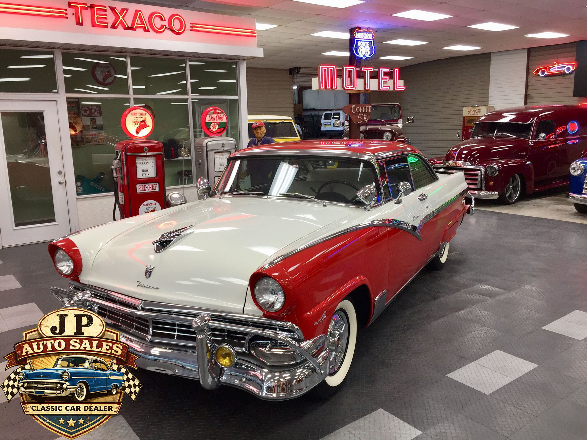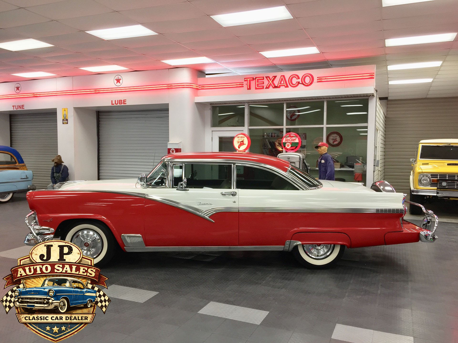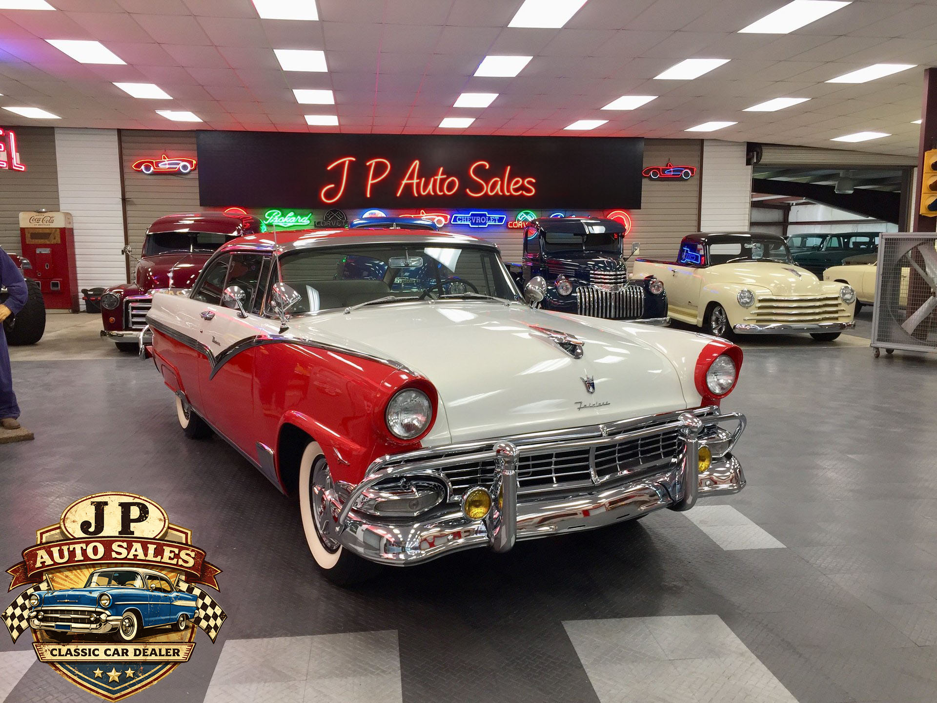 1956 Ford Fairlane Victoria 2 Door Hardtop – Powered by a 292 V8 with a 4-barrel carb, paired with an automatic transmission. Features include a classic red and white exterior, black and white interior, air conditioning, power steering, AM/FM/AUX radio, and tinted windows. Equipped with electric wipers, dual master cylinder, Petronix electronic ignition, fog lights, and a Continental kit. Additional touches include fender skirts, wide white radial tires, and front/rear cattle bars for a standout look.