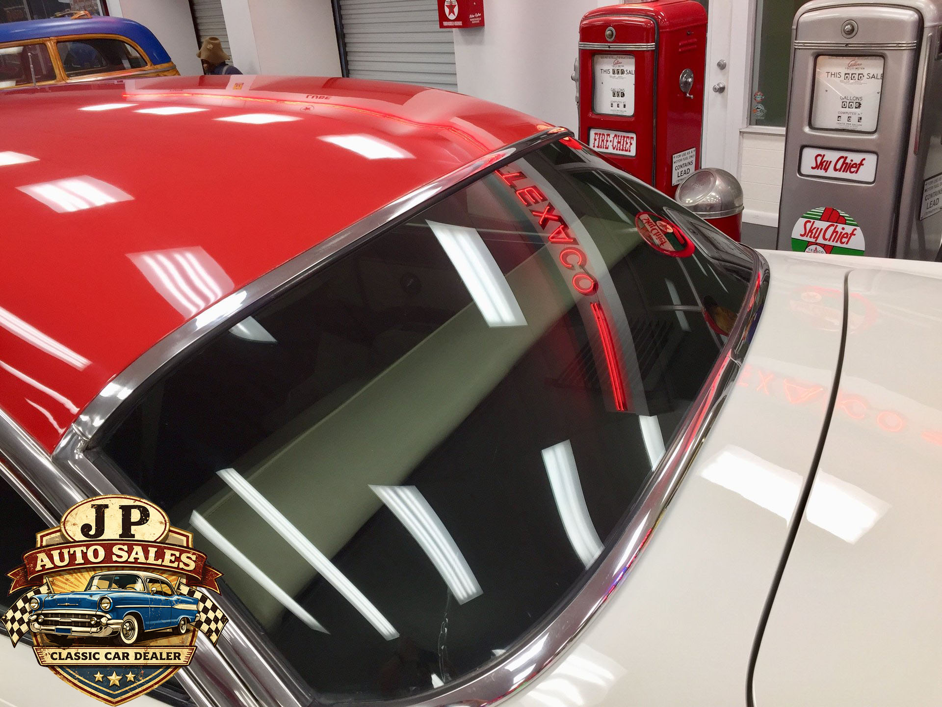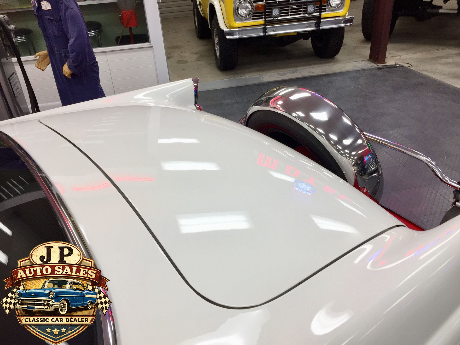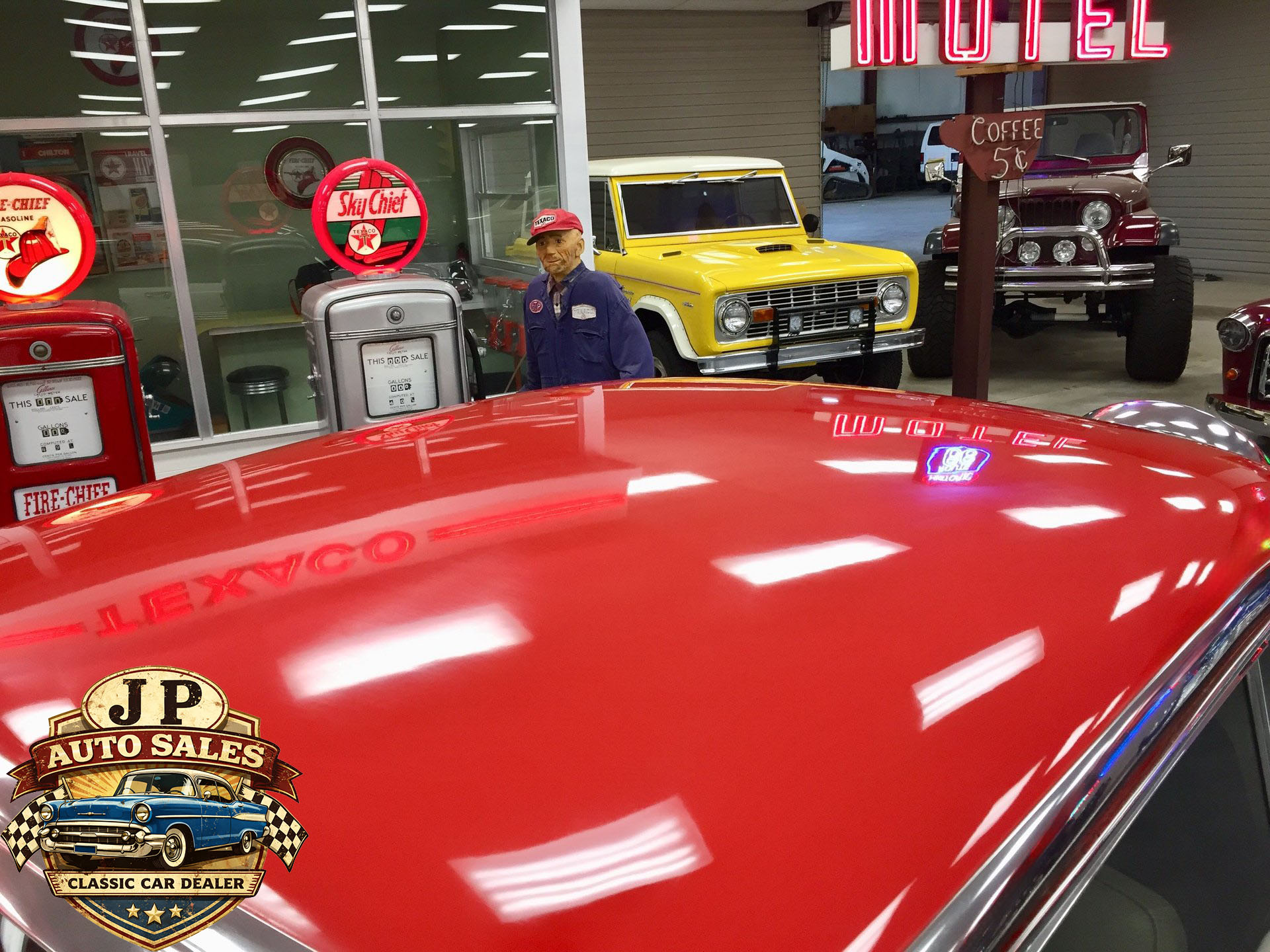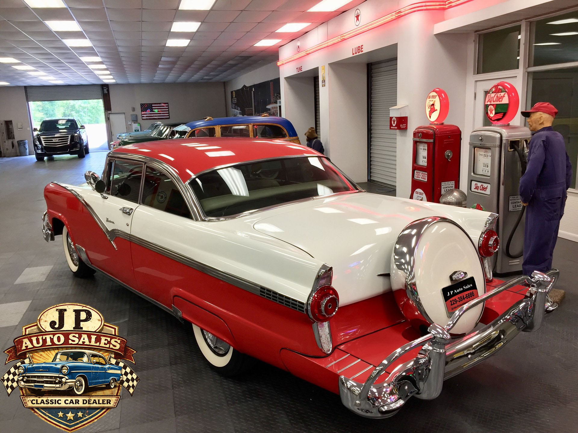 1956 Ford Fairlane Victoria 2 Door Hardtop – Powered by a 292 V8 with a 4-barrel carb, paired with an automatic transmission. Features include a classic red and white exterior, black and white interior, air conditioning, power steering, AM/FM/AUX radio, and tinted windows. Equipped with electric wipers, dual master cylinder, Petronix electronic ignition, fog lights, and a Continental kit. Additional touches include fender skirts, wide white radial tires, and front/rear cattle bars for a standout look.